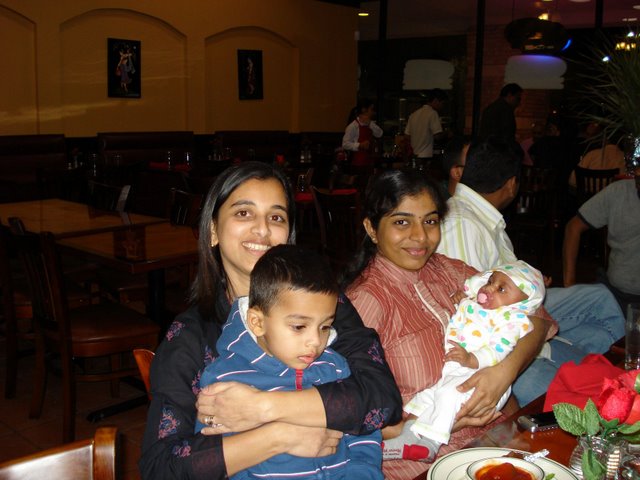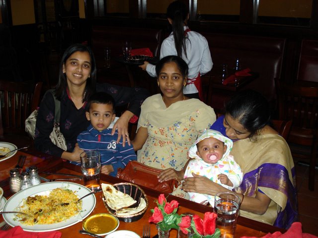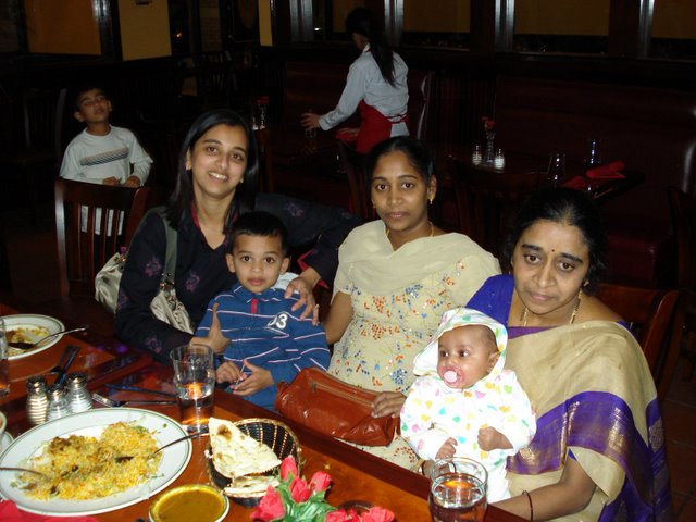Jan 11th,  2009 - In the morning, it was Samarth's birthday and in the evening Ramesh Uncle came to our place with his family and we all went to a new Indian restaurant, Aahar, for dinner. Ramesh Uncle had come with his wife and baby daughter, Dhatrishri. Ramesh Uncle brought me a new Dinoco car and a new helicopter toy as well. He had also given me a big Honda car before which I always remember. At the restaurant, we met Adarsh Uncle and his wife Katy too. We sat there for quite a long time and it was a fun evening. The food was good too. |